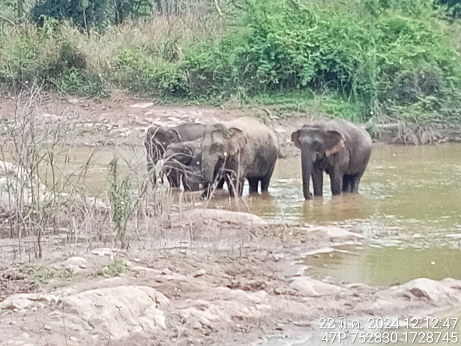 On March 22, 2024, the Foundation's field staff at the Upstream Camp found elephants from the Pornchita group playing in the water at the area of KM 3. The second group is the Pang Doremi group. The location was found at the foot of the mountain, Km. 16 (three houses). The elephant ran away, so the staff were unable to take a photo in time.